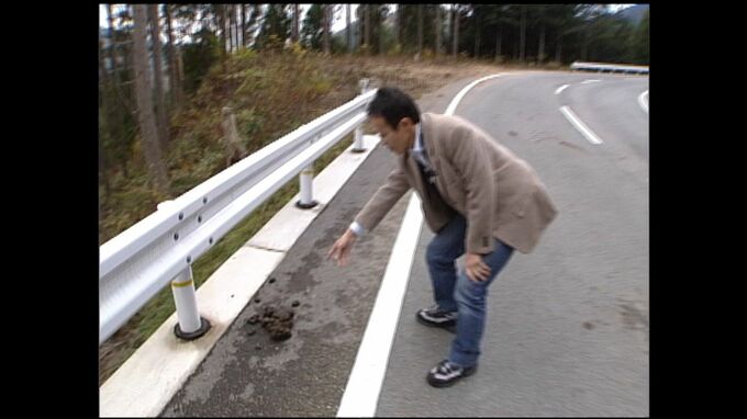 山の斜面を転がり落ち、その下の道路で一度バウンドしたことが、ひび割れたアスファルトから推測できます。その後、民家の屋根を突き破って、和室の畳の上に…。