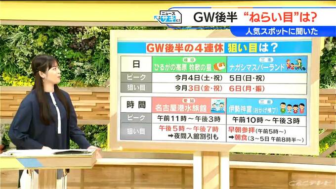 東海3県の人気スポットに狙い目の日を聞いてみました。ゴールデンウィーク後半の4連休、どこも混んではいるんですけれども、岐阜県の「ひるがの高原 牧歌の里」のピークは5月4日と5日ですので、3日と6日が狙い目かもということでした。三重県の「ナガシマスパーランド」も同じでした。