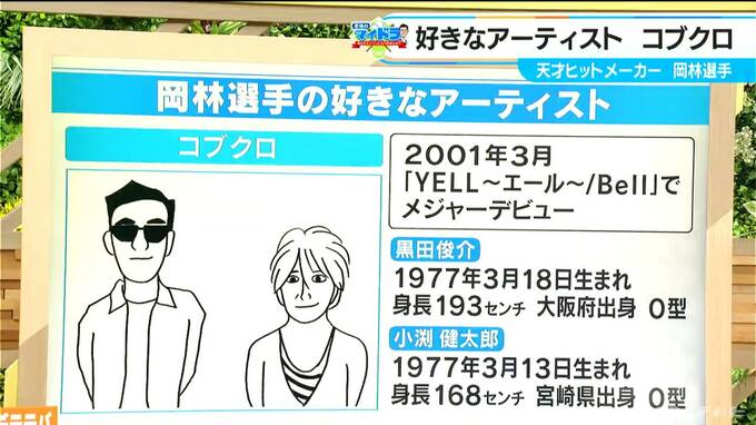 “登場曲をカラオケには入れにくい説”も語っていただきました。岡林選手はコブクロの大ファンということなんです。今回も、大人の事情でご本人の写真は出せないため、私が似顔絵を書かせていただきました。