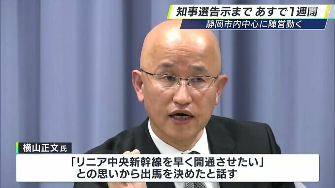 新たに、政治団体代表で菊川市出身の横山正文氏も出馬を表明。横山氏は「リニア中央新幹線を早く開通させたい」という思いから出馬を決めたと話しました。