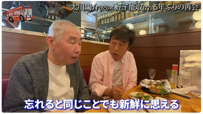蛭子さんは、再会した太川さんに「覚えてる?」と、レストラン前で声をかけられて、穏やかな笑顔で頷きました。かつて蛭子さんと太川さんは旅番組で2007年から10年近く共演。その後2020年に蛭子さんは認知症を公表していました。