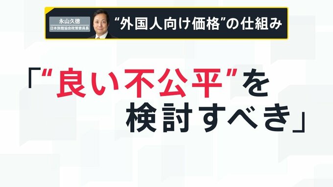 日本旅館協会政策委員長 永山久徳さんは、二重価格について「“良い不公平”を検討すべき」としています。