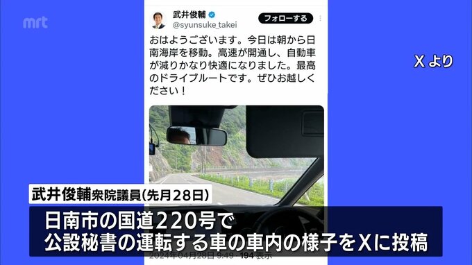 武井氏は、先月28日、日南市の国道220号で公設秘書の運転する車の車内の様子をXに投稿しました。