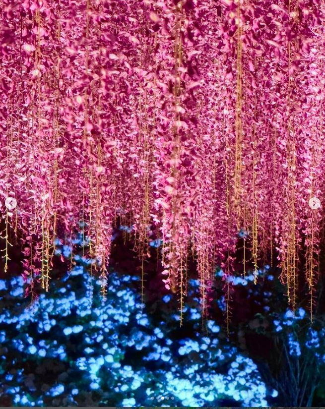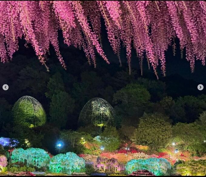 蜷川さんは「今年もなんとか間に合った。この世のものとは思えないあしかかがフラワーパークの大藤 毎年毎年何回も通いつめてるけど,毎回新しい感動がある。」と毎年通っていることを明かし、「やっぱりほんとに美しいなぁー」と大藤の間から光がきらめいている写真を投稿しました。