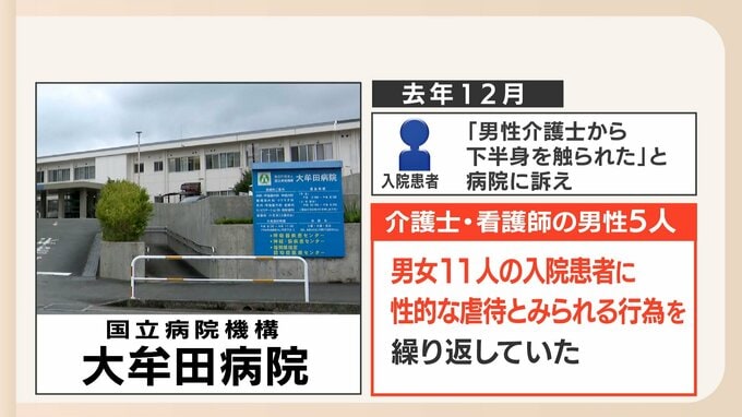 病院によりますと、虐待に関与したのは介護職員3人と看護師2人、いずれも男性職員です。去年12月、入院患者の1人から「介護士の男性に下半身を触られた」と訴えがあり発覚しました。