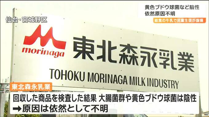 東北森永乳業が回収した商品を検査した結果、大腸菌群や黄色ブドウ球菌は陰性で、原因は依然としてわかっていません。また、保健所の立ち入り調査でも製造工程について問題点の指摘はなかったということです。
