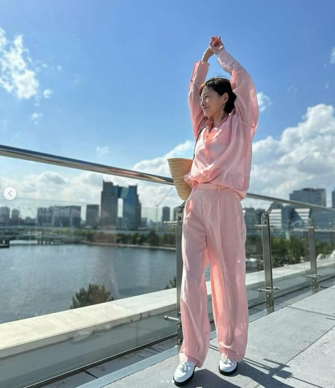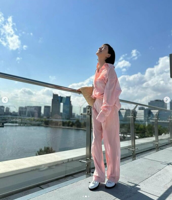 インスタグラムでは、爽やかな青空のもと、笑顔でピンクの衣装をまとった写真を公開。