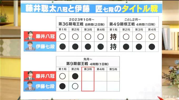 2人が対局するタイトル戦は今回が3回目。これまでに竜王戦、棋王戦でも戦っています。竜王戦は藤井八冠が4連勝。持ち時間が8時間と長いので、考える時間が長くなってミスが少なくなる。