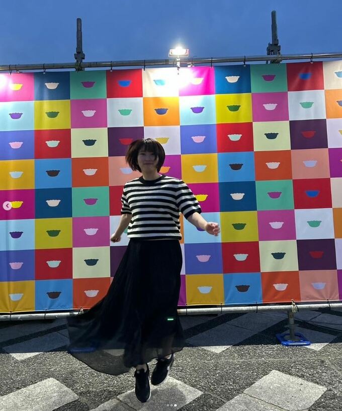 2枚目は「無限餃子」というキャッチコピーと共に餃子のマークが描かれたゲートの写真。そして3枚目には、色とりどりの下地に色とりどりの餃子マークが並ぶカラフルなパネルの前で、満ち足りた笑顔で小さく跳ねる志田さんの姿が投稿されています。