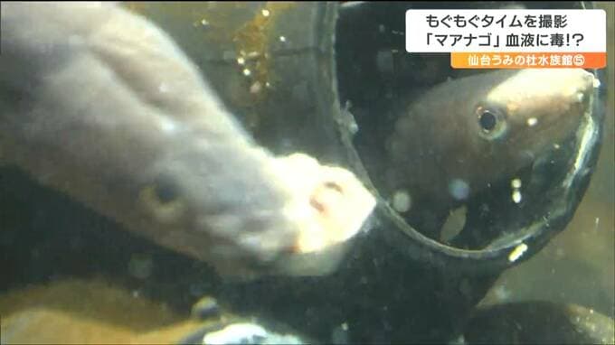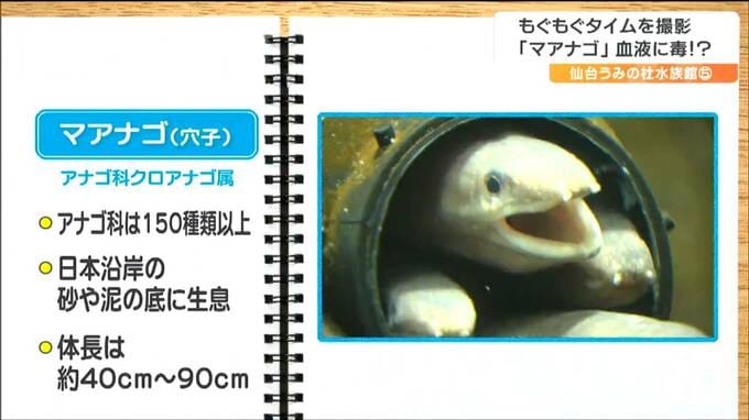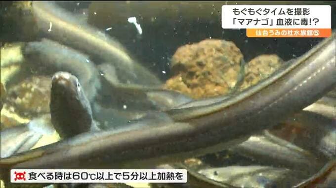 仙台うみの杜水族館の生き物たちをシリーズで紹介、5回目は「マアナゴ」です。いつも筒の中で身を寄せているマアナゴ。今回は元気よく泳ぎまわりご飯を食べる珍しい姿を撮影しました。そして、血液に毒があるというマアナゴの生態を探ります。