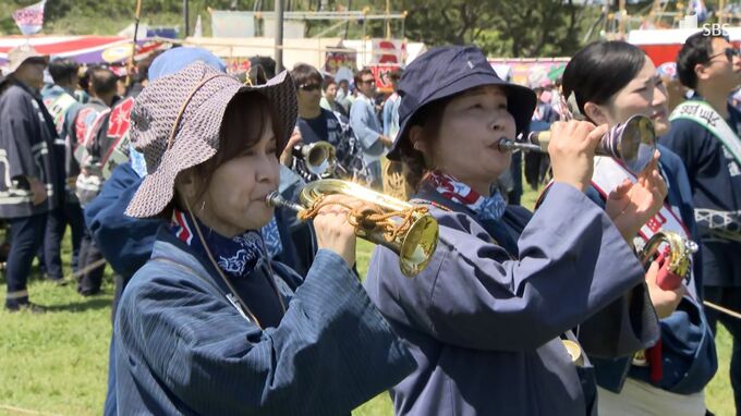 3日午前10時に開幕した「浜松まつり」。浜松市中央区の凧揚げ会場ではラッパの音が響くなか一斉に凧が揚がり、熱気に包まれました。