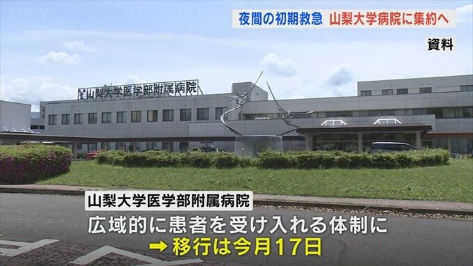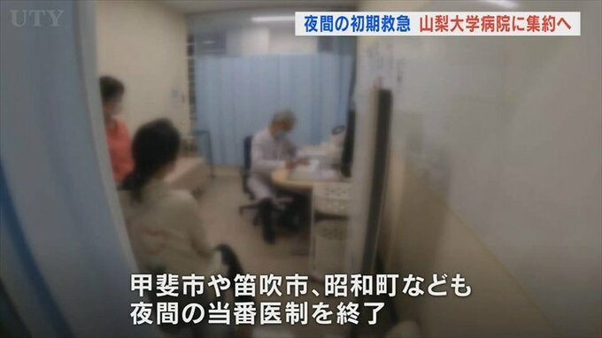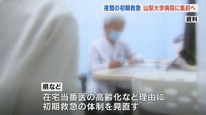 夜間の在宅当番医の高齢化などを理由に、県などは初期救急の体制を見直し、山梨大学医学部附属病院が広域的に患者を受け入れる体制を整えました。