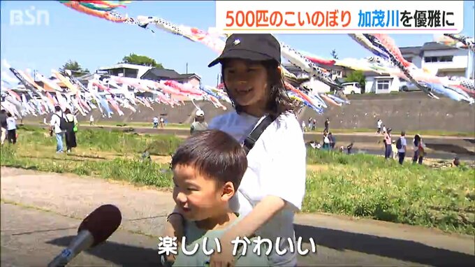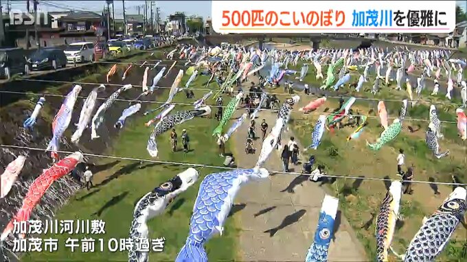 加茂市を流れる加茂川、その上を気持ちよさそうに泳ぐのはおよそ500匹のこいのぼりです。