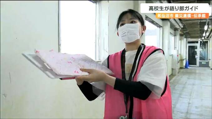 ゴールデンウイークを利用し宮城県内の被災地を訪れる人に震災の教訓を伝えようと、気仙沼市の震災遺構・伝承館で3日、高校生が語り部ガイドを行いました。