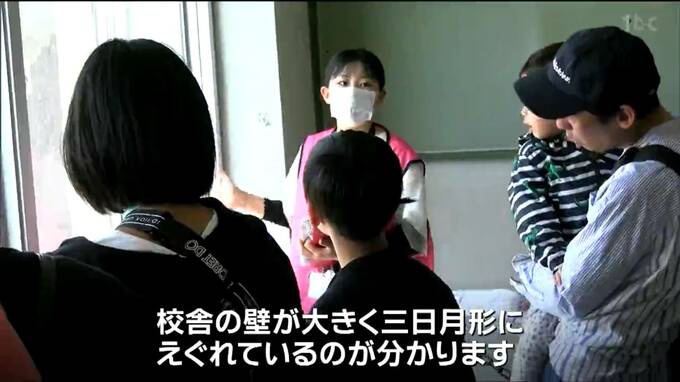 「校舎の壁が大きく三日月形にえぐれているのが分かります」
