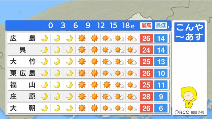 きょう3日(金)の広島県内は、高気圧に覆われてよく晴れました。安芸太田町加計28.2℃、庄原26.2℃、三次26.1℃。内陸では各地で夏日となりました。