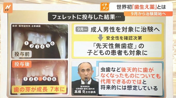 この薬については、9月から成人男性を対象に治験をして、薬の安全性を確かめていくそうです。その後、先天性無歯症の子どもの患者を対象に使用していくということです。