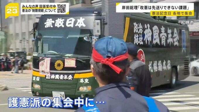 札幌市では護憲派に反対する団体の街宣車が大きな音で繰り返し近づき、警察が道路を規制する一幕も。