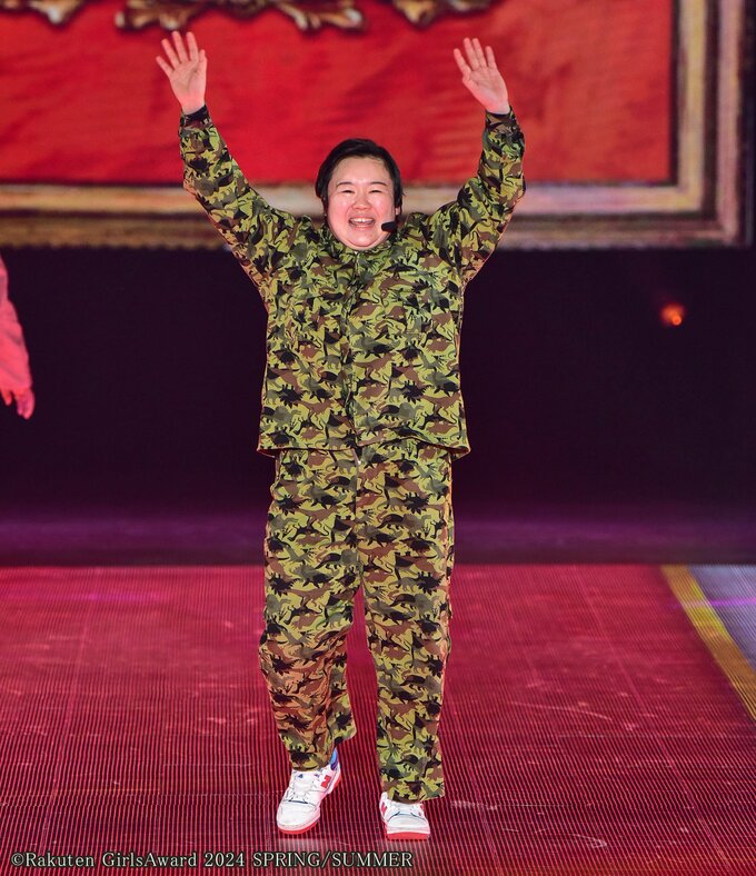 初出演となったやす子さんはお馴染みの迷彩服姿にヘッドセットを付けて登場。「はいー」「サンデージャポンお願いします」「ありがたいです」と会場に集まった観客に挨拶をしながら、笑顔でランウェイを歩きました。