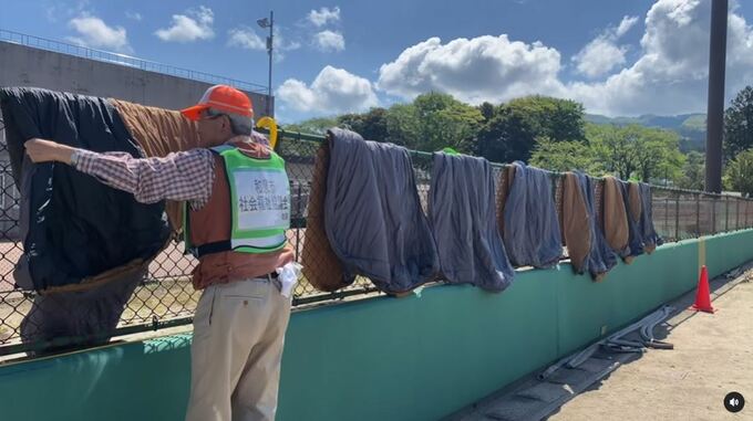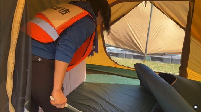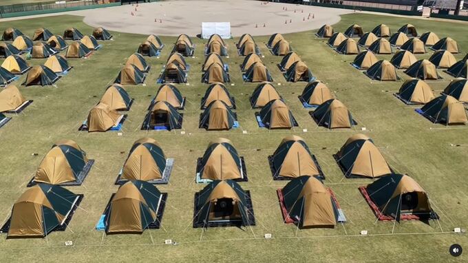 テント村は「七尾城山野球場」の場内に設営されています。動画の冒頭は、外野側に整然と同一規格のテントが並ぶ様子が紹介されています。テントの接地面は複数のマットが層にして敷かれていて、地面からの冷えを遮る工夫がなされています。