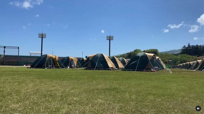 そのほかにも、ダッグアウトを炊き出しスペースとして利用していたり、外野側の大きな共用テントを寛ぎの場にしていたり、テント村全域にWi-Fiが巡らせてあってスマホやタブレットも使用できるとのこと。