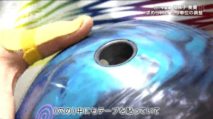 「これテープで、ボールの指の穴の中にもテープ張ってて。親指ここにもテープ張っているので、入れてみて、その日の気温とか指のむくみとかによって調整する」