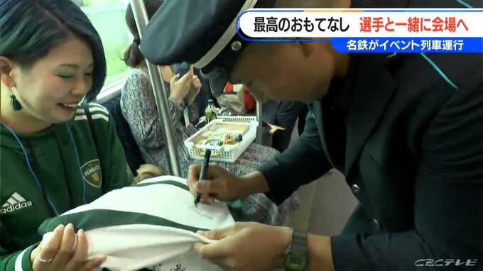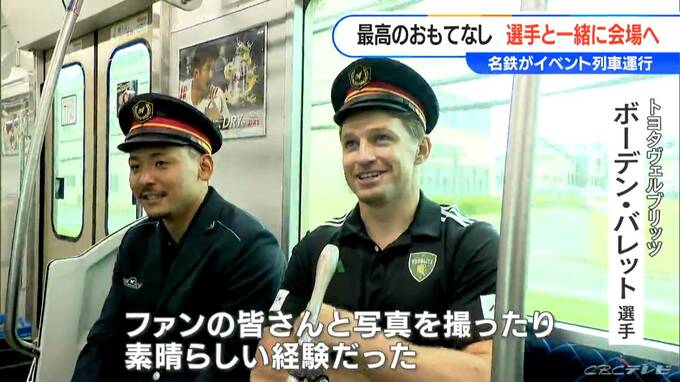 金山駅を出発し、イベント会場に近い豊田市駅まで、名鉄の制服姿になった主力選手6人とファン100人がビールや軽食などを片手に交流しました。