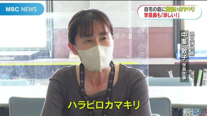 ハラビロカマキリは本州以南に分布し、県内でも数多く生息しています。通常は緑色などで、これほど鮮やかな黄色の個体を見たのは、中峯さんも初めてと話します。