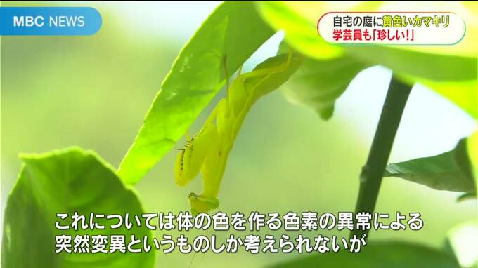 専門家も珍しいと話す黄色のカマキリ。
