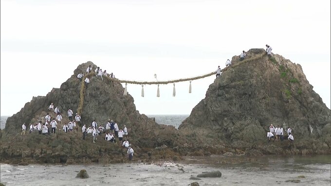 福岡県糸島市の二見ヶ浦で6日、夫婦岩を結ぶ大しめ縄の掛け替えが行われました。五穀豊穣や家内安全を願う神事です。 糸島市の桜井神社では、6日午前9時から、二見ヶ浦の夫婦岩を結ぶ大しめ縄を編み込む作業が行…