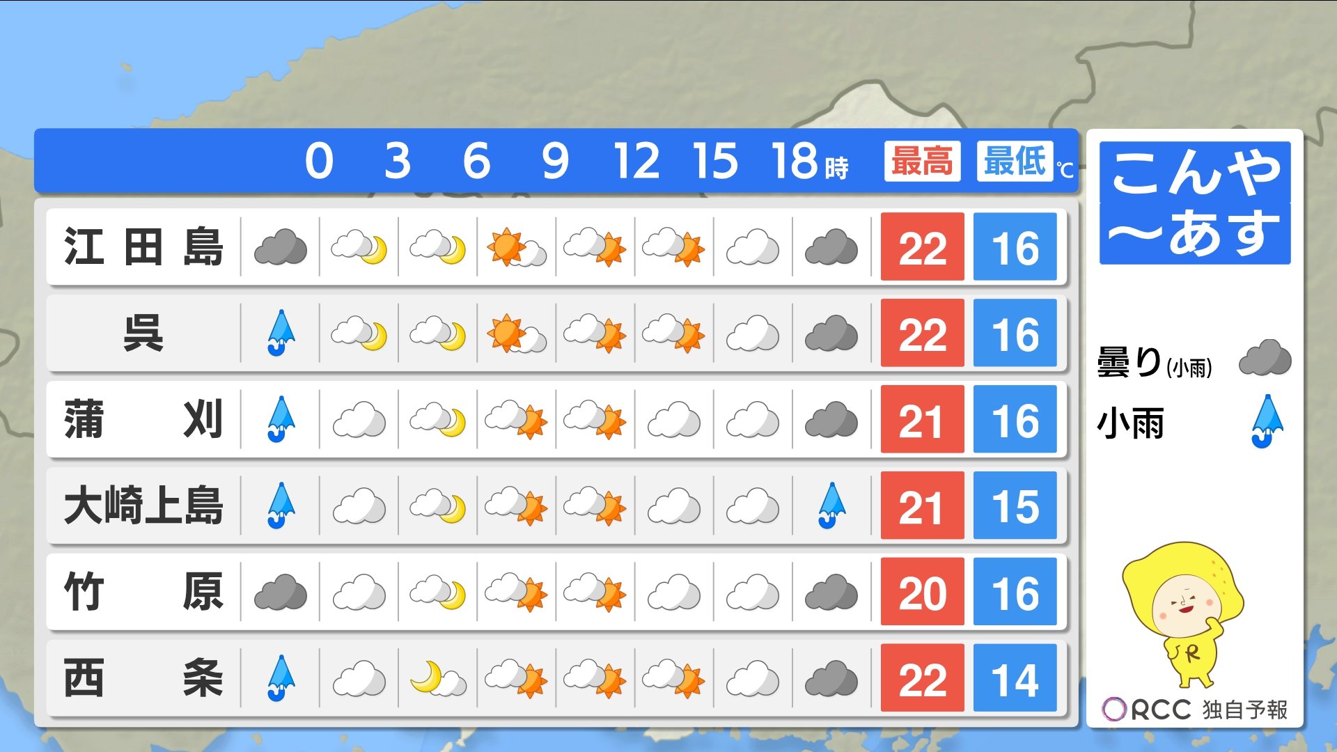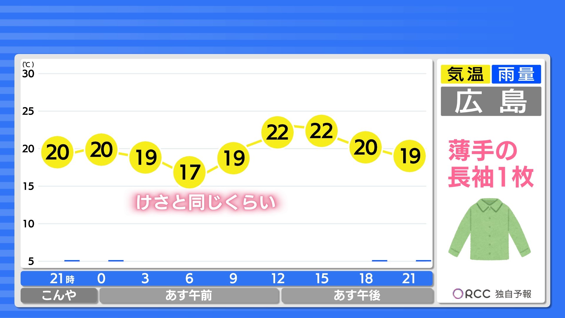 きょうは日差しが届きにくかった分、気温はあまり上がらず、きのうとくらべると5℃前後低いところが多くなりました。庄原では21.9℃、広島市中区では21.4℃でした。