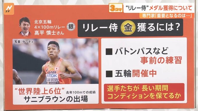 バトンパスなどの事前の練習や、オリンピック開催中に、選手たちが長い期間コンディションを保てるかというところが重要になるそうです。
