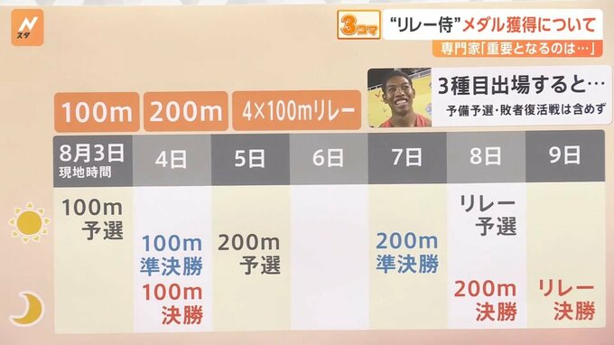 例えば選手が100m、200m、4×100mリレーの3種目に出る場合、約1週間、良い状態をキープしなければならず、大変だということです。