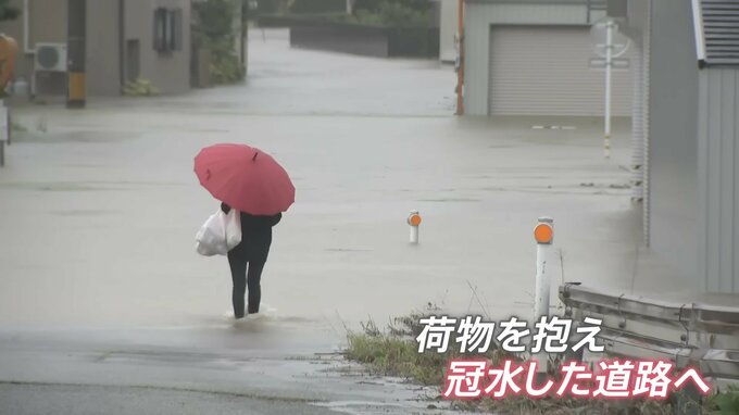荷物を片手に、冠水した道路に入っていく女性がいました。 水をかき分けながら恐る恐る進みますが、水の深さはどんどんと増していきます。最終的に水面に傘がついてしまうほどの深さになっていました。