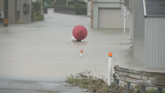 千葉県茂原市では、大雨の中、突然雷が落ちました。夕方になっても降り続け、自動車のタイヤが隠れるほど、道路は冠水しています。道行く人たちは水をかき分けながら歩いていました。