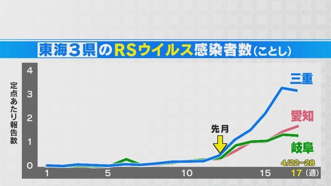 現在、全国的に流行しているのが「RSウイルス感染症」です。愛知県の感染者数も、4月から急激に増えています。また、岐阜と三重も、同様に増加傾向です。