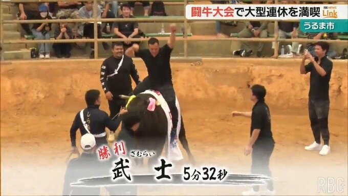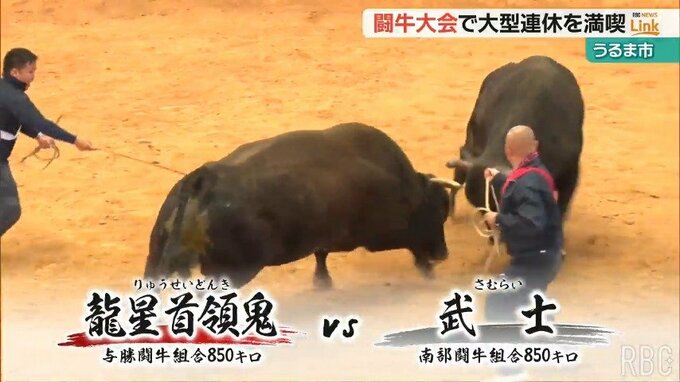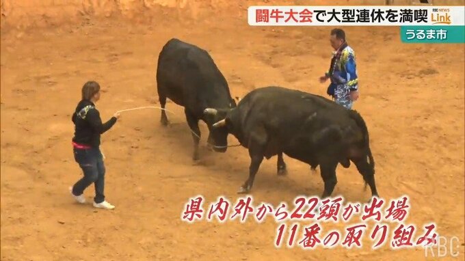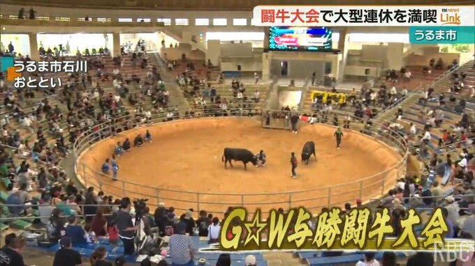 大型連休を沖縄の伝統娯楽で楽しんでもらおうとうるま市で闘牛大会が開かれ、手に汗握る熱戦が繰り広げられました。