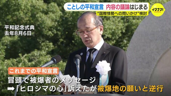会議は非公開で行われ、初回のきょうは「平和宣言」の構成や内容について話し合いました。この中では、松井市長が宣言の冒頭に、ウクライナなど国際情勢への問いかけから入る案を提案すると、委員から賛同の声や、若い世代に伝わるようにすべきだといった意見が上がったということです。