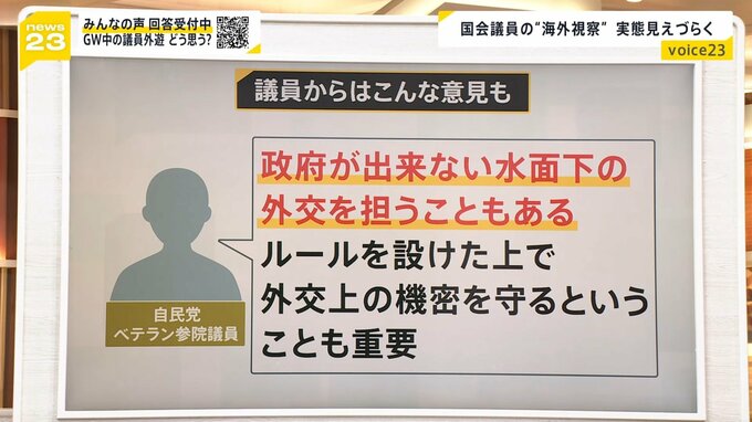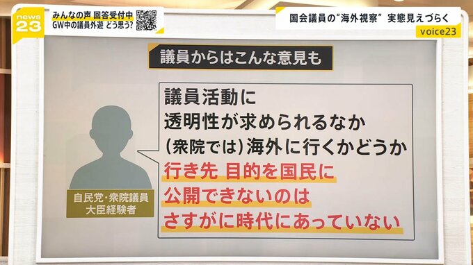 「議員活動に透明性が求められるなか、(衆院では)海外に行くかどうか、行き先・目的を国民に公開できないのはさすがに時代にあっていない」