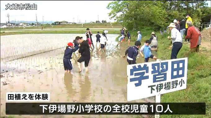 田植えを体験したのは大崎市松山の下伊場野小学校の全校児童10人です。