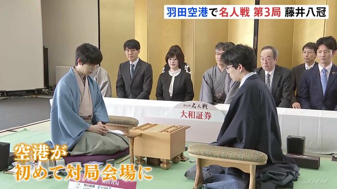 羽田空港第1ターミナルにつくられた将棋の対局会場。藤井聡太八冠(21)に豊島将之九段(34)が挑む「名人戦」七番勝負の第3局が午前9時ごろに始まりました。空港が対局会場になるのは、初めてのことです。ここま…