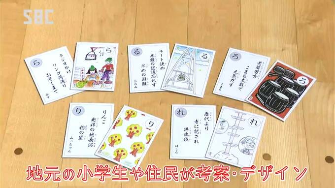 長野市長沼地区の住民自治協議会が、地域の良さを再確認してほしいと、市の補助金を活用して2023年の10月から作り始めたもので、読み札と絵札は地元の小学生や住民が考えました。