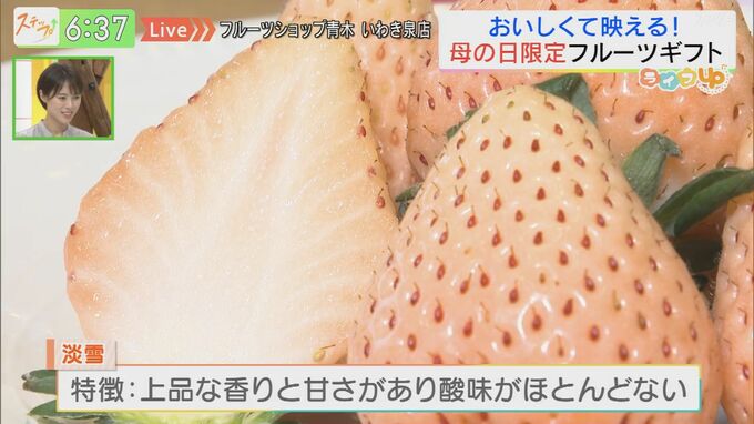 メロンや柑橘類をはじめ、果肉が黄色の甘みが非常に強い『ゴールドキウイ』、そして白いイチゴの『淡雪』など2種類のイチゴが入ったギフトセット。イチゴと言えば、赤ければ赤いほどおいしいというイメージがありますよね?白いイチゴの『淡雪』は上品な香りと甘さがあり、酸味がほとんどないのが特徴なんです。さっそく、末永アナが試食。