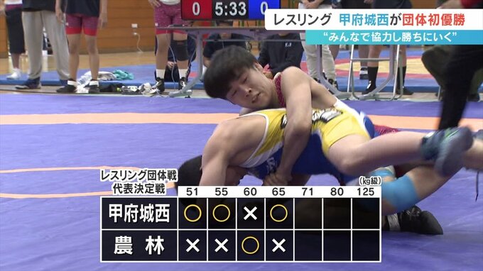 団体戦は7つの階級で行われ、甲府城西は初戦の51kg級と続く55kg級、4戦目の65kg級を勝って初優勝に王手をかけます。