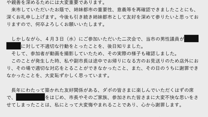 同席した議員が、その場を撮影したという動画を見た藤井浩人市長は、ディカーソン市長宛てにメールで謝罪文を送ったということです。