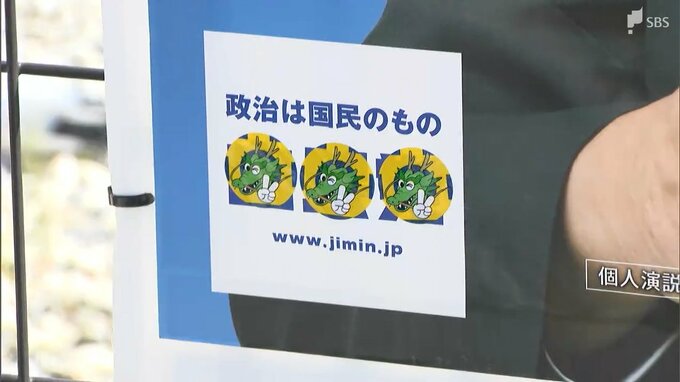 「浜松市中央区、街のあちこちに貼ってある塩谷立議員のポスターです。もともと印刷されていた『自民党』の3文字は、龍のシールで隠されています」