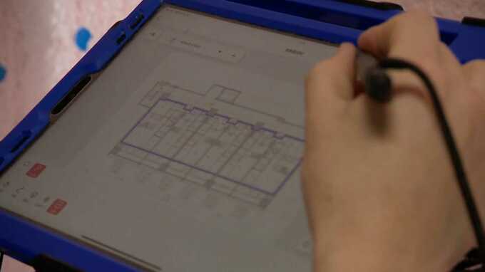 「建物の間取りの平面図をタブレットに入れ、記入しています。記入したものは、現場内でも、業者さんからも、どこからでも直接見られるようになります」