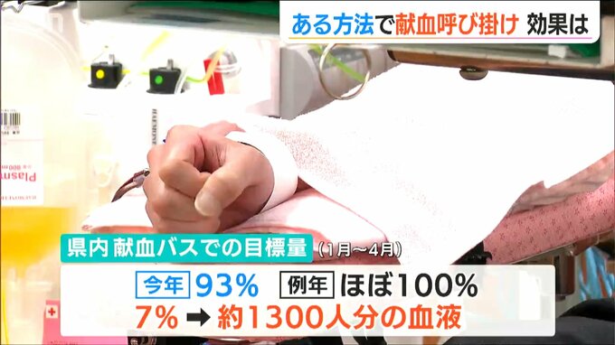 県内の献血バスでの目標とした量は例年ほぼ100%達成できたのに対し、今年1月から4月は93%と目標を達成できませんでした。7%はおよそ1300人分の血液にあたります。