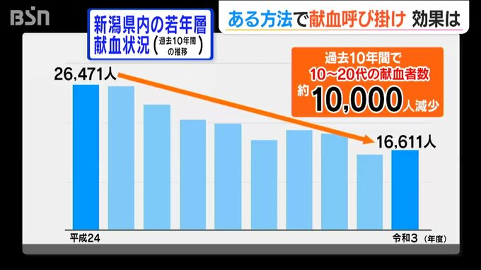新潟県内では献血の協力者が減っています。とくに若者はここ10年で1万人減少していて、関係者がある方法で献血の協力を呼びかけました。その効果は?