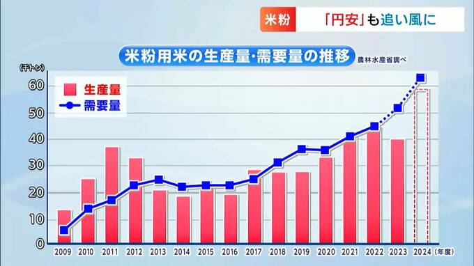 小麦価格が高騰した時期には米粉との価格差が小さくなり、小麦の代用品として注目されたのです。農林水産省のデータでは今後も米粉用米の需要と供給が伸びると予想されていて、製粉会社も需要拡大を見込んでいます。